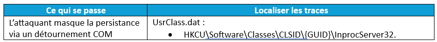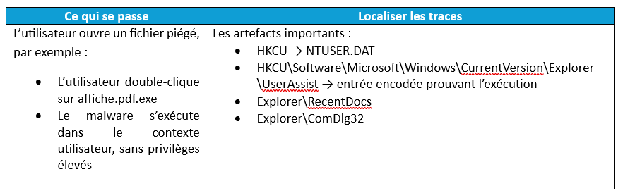 La chronologie suivante illustre les étapes classiques d’une une attaque typique, depuis une exécution utilisateur jusqu’à une compromission avancée prête pour le mouvement latéral et les artefacts du registre qui permettent de confirmer chaque phase. Le présent cas est basé sur une intrusion réelle